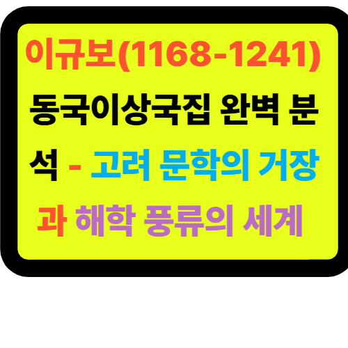 『동국이상국집』은 이규보의 필생의 역작으로, 고려 문학의 보고(寶庫)라 할 수 있는 방대한 문집입니다. 이 문집을 통해 우리는 고려 후기의 정치, 사회, 문화 전반을 생생하게 엿볼 수 있습니다. 📖